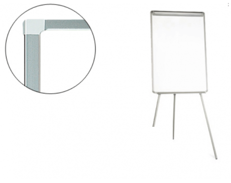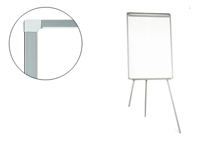 Quadro tripé com caixilho de plástico cinza. Superfície laminada em cor branco, apta para escrita direta com marcadores de quadro. Também apto para bloco de papel graças à sua mola superior. Pés telescópicos com altura regulável até 200 cm. Com prateleira inferior para marcadores e outros acessórios.
