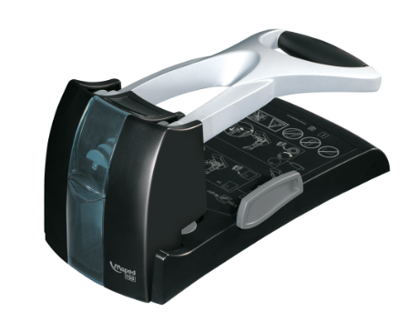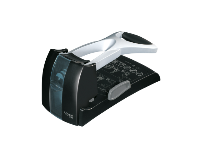 Alavanca confortável. Guia ajustável para o papel. Com compartimento para peças de recarga. Com 4 discos de recarga e manual de instruções, com capacidade para 150 folhas.