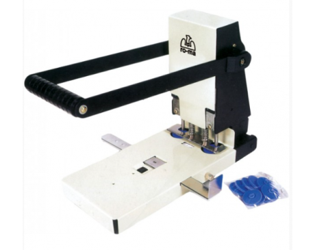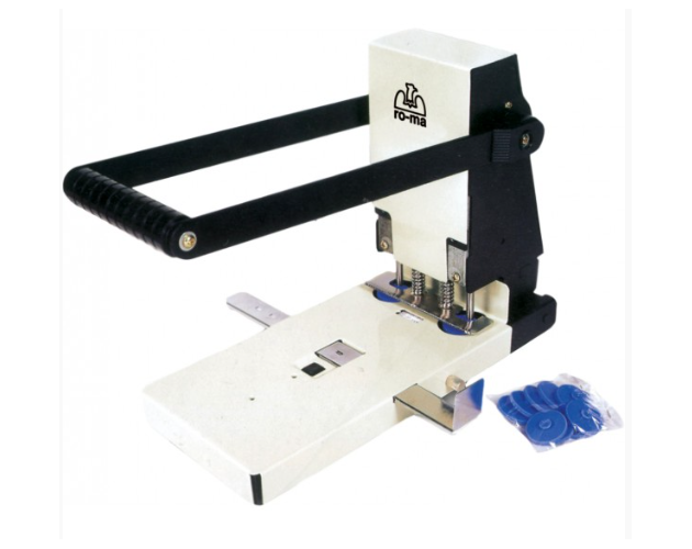 Alavanca confortável. Guia ajustável para o papel. Com compartimento para peças de recarga. Com 4 discos de recarga e manual de instruções, com capacidade para 150 folhas.